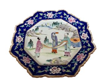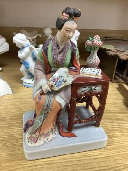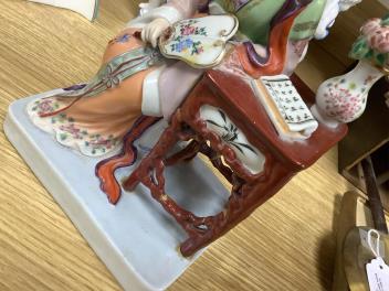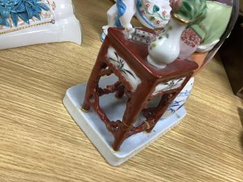 Dish, vase and stand good. Figure and table have been broken off, subsequently glue-repaired, including across he upper body, see images 4, 5 and 6.