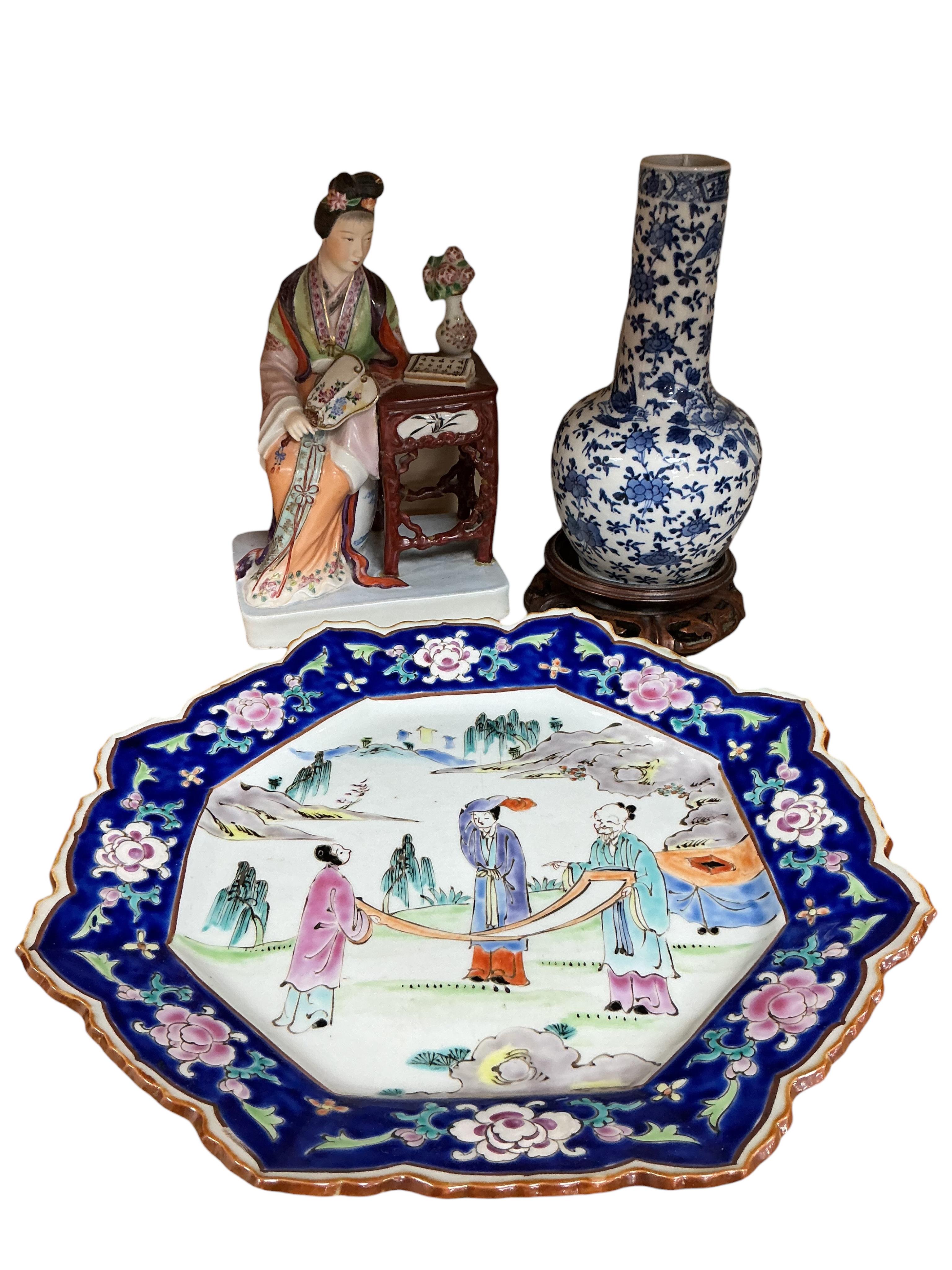 A Chinese blue and white vase on stand, a seated figure and figural dish- 30cm wide