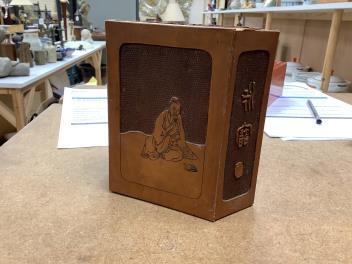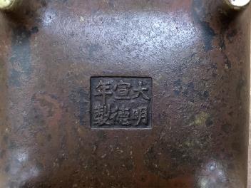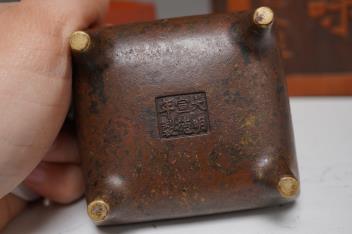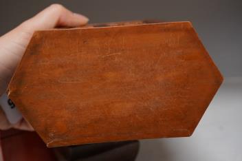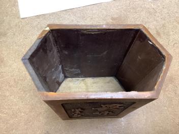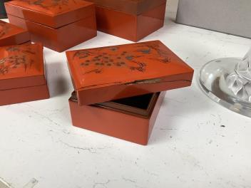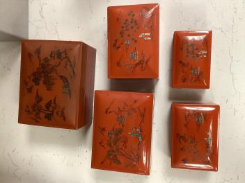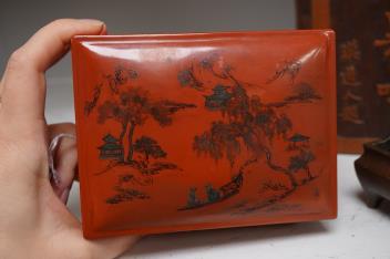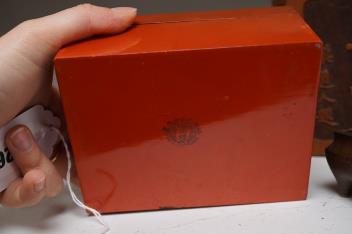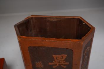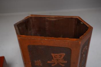 Censer structurally good; some rubs and wear; apocryphal Ming Xuande mark. Hexagonal vase chips and losses around neckrim as shown; footrim with small chip and a crack. Graduated set of five lacquer boxes - outer box faded; third-biggest box cover poorly glue-repaired.