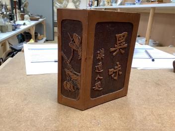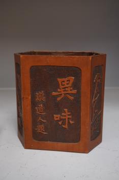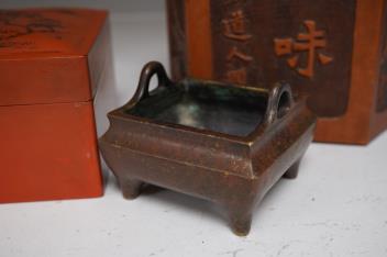 Lot 1326 , A Chinese bronze censer, together with a carved wood hexagonal vase and a lacquer set of stacking boxes, largest 14cm high