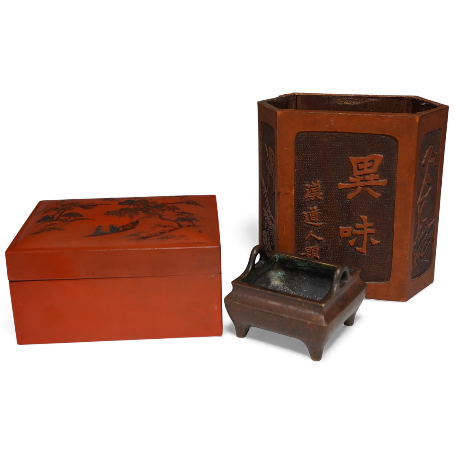 A Chinese bronze censer, together with a carved wood hexagonal vase and a lacquer set of stacking boxes, largest 14cm high