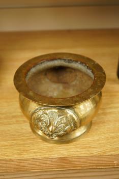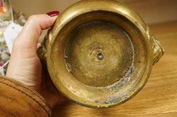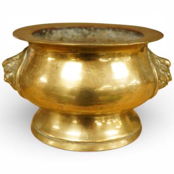 Lot 398 , A Chinese bronze censer with mask handles, early 20th century, 13cm diameter.