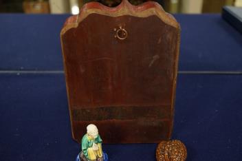 A Chinese carved and giltwood panel, sancai figure and carved coquilla nut, largest 21 x 14.5cm