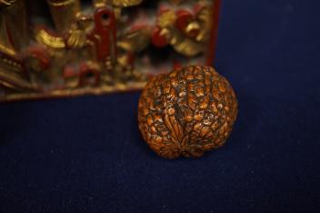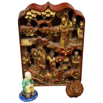 Lot 2479 , A Chinese carved and giltwood panel, sancai figure and carved coquilla nut, largest 21 x 14.5cm
