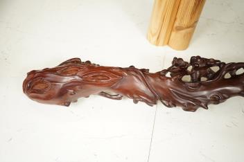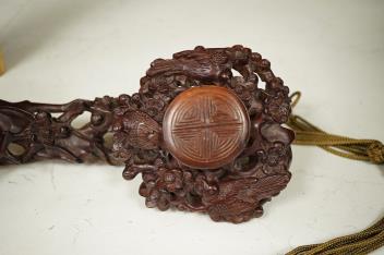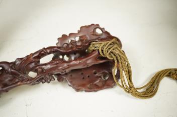 Lot 1431 , A Chinese carved hardwood Ruyi sceptre, with two porcelain ‘dragon’ beads, 50cm in length
