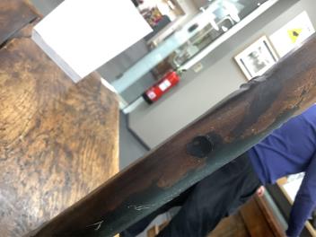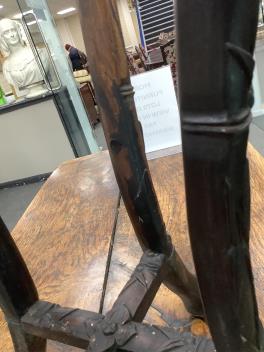 Marble is heavily scratched. Minor chips and losses. One leg discreetly repaired just above the stretcher using a dowell to secure, cracks to be seen around this area, see further images.