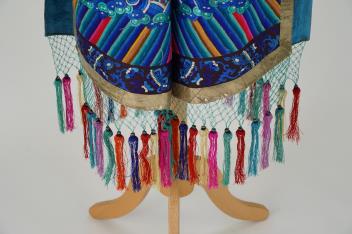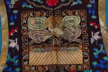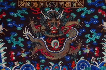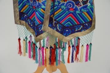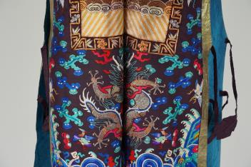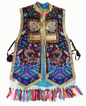 A Chinese embroidered silk vest, xiapei, early 20th century, the front decorated with a silver pheasant square above a pair of dragons chasing a flaming pole amid clouds, above waves and lishiu stripes, the reverse with confronting dragon below, coloured tassel fringe, total height 106cm