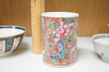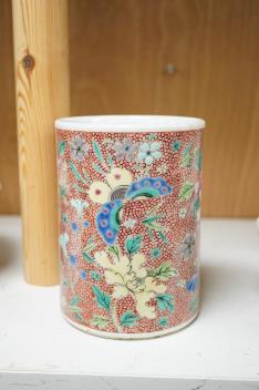 Lot 1507 , A Chinese famille rose cylindrical brush pot enamelled with butterflies amongst flowers, 14cm high