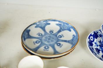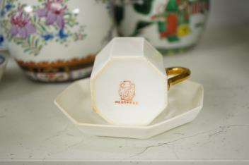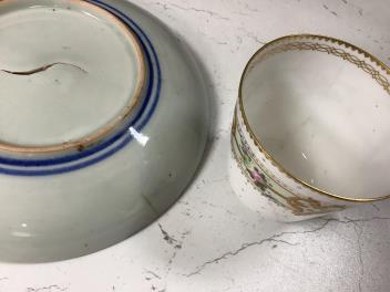 Samson jar no cover. One Chinese plate crack inward from rim, approx. 8mm. Smaller teabowl rim with tiny chips, not serious. One French cup cracked. Others good. One Wedgwood cup unusually marked “Manufactured for James Powell & Sons, Whitefriars Glass Works, LONDON”.