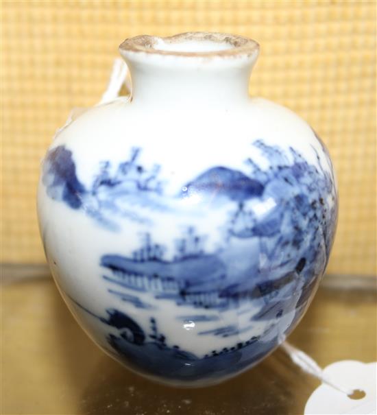 A Chinese miniature blue and white ovoid vase, possibly late Ming, Tianqi period, painted with a figure fishing in a mountainous river landscape, 6.5cm, unglazed rim