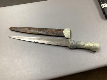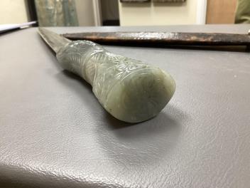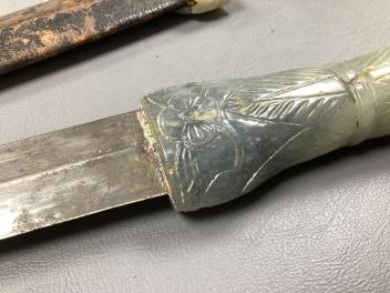 The Jade handle and mount have typical inclusions in the stone, the leather scabbard is very worn and cracked and missing part of the tip, the steel blade has some oxidisation and rust in places, otherwise in reasonable condition