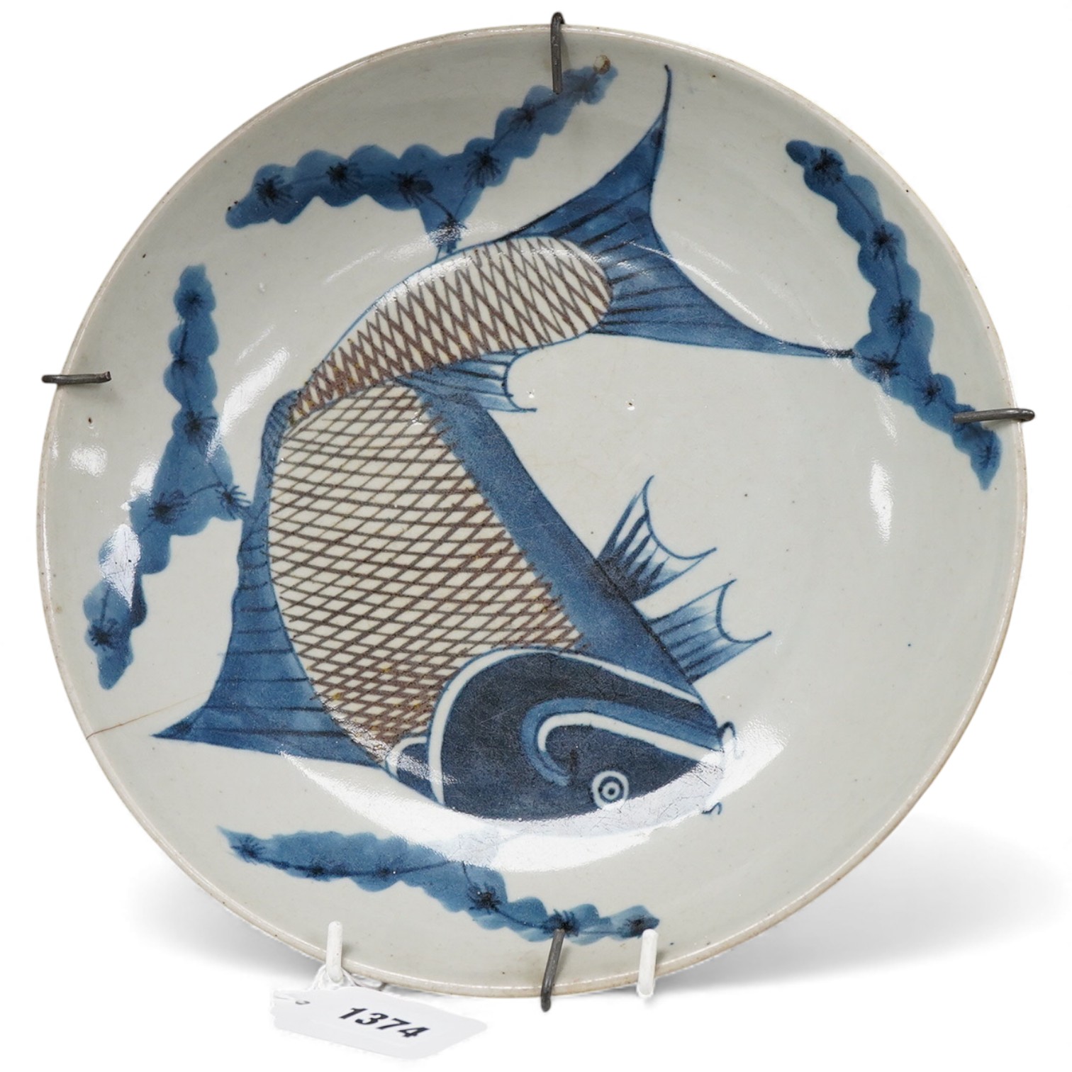 Lot 1374 , A Chinese porcelain dish painted with a Koi Carp, under-glazed in blue and red, 27cm