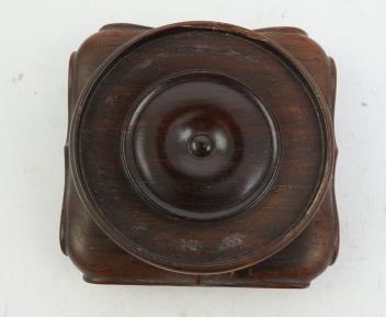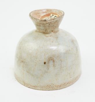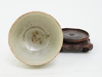 A Chinese qingbai stem cup, Song dynasty, the deep rounded bowl on a conical shaped foot, 6.2cm high, faults, wood stand