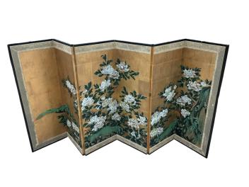Lot 1475 , A Chinese six fold screen, each panel width 34cm, height 95cm
