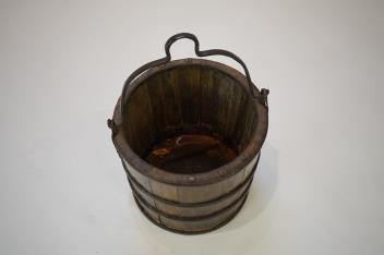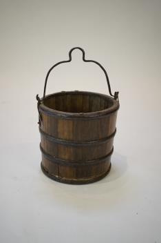 A Chinese staved wood bucket and a coopered oak bucket with wrought iron swing handle, largest 61cm high