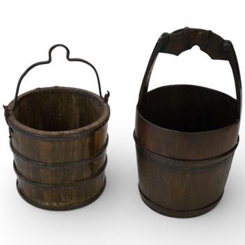 Lot 2 , A Chinese staved wood bucket and a coopered oak bucket with wrought iron swing handle, largest 61cm high