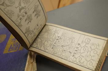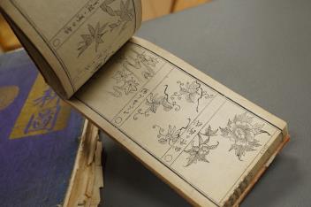 Lot 438 , A Chinese text book, Imperial farming and silk production, and a smaller Japanese text book, 1874, brocade designs, largest 28x18cm