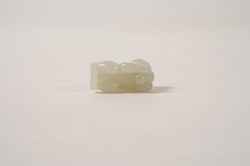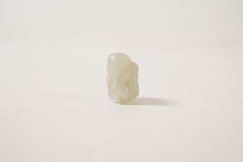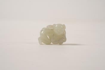 A Chinese white jade figure of a crouching boy, 19th/20th century, carved in high relief and openwork with a boy grasping a branch of gourds and lingzhi fungus on his back, the stone of good even tone, 3.9cm long