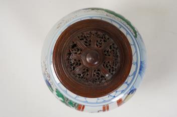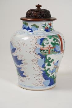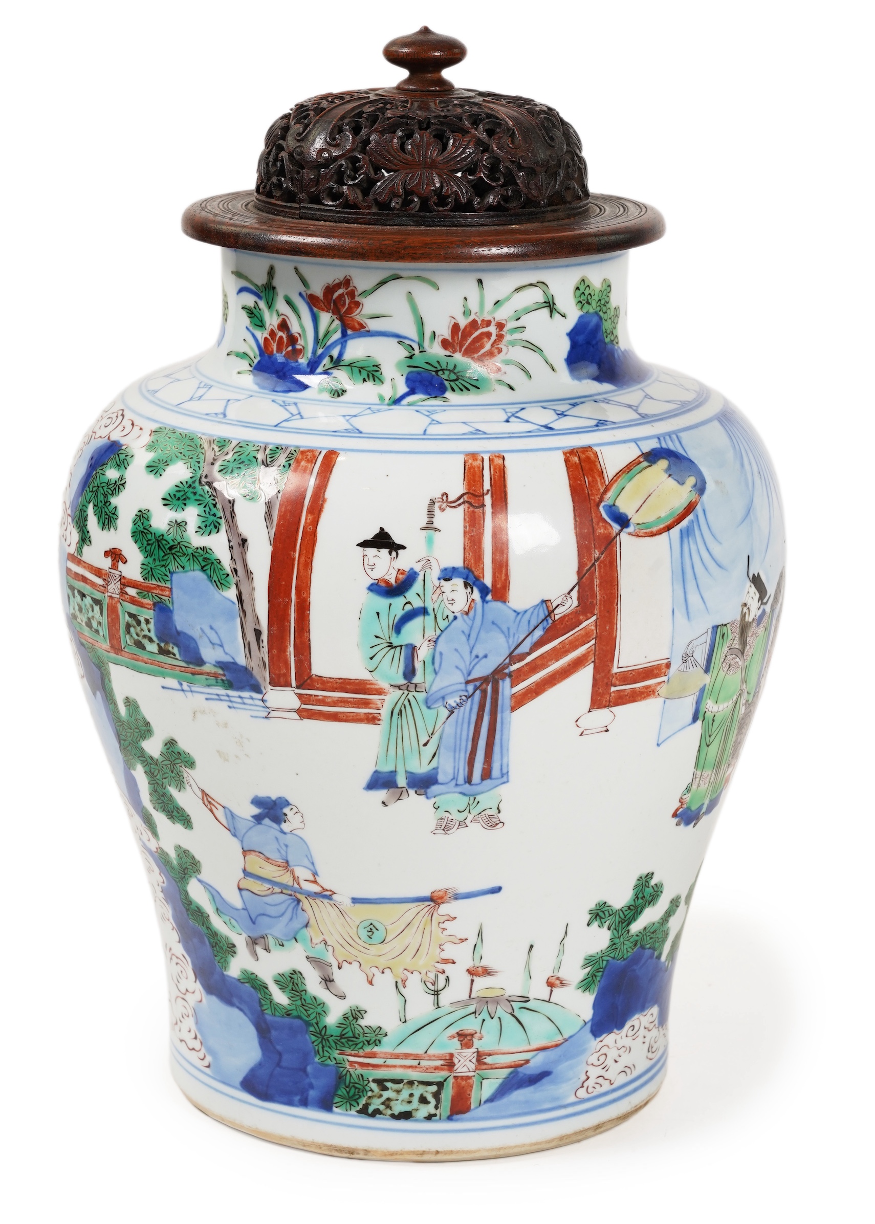 A Chinese wucai baluster jar, possibly Shunzhi / Kangxi period, painted with dignitaries and a tiger in an interior in pavilion gardens, the shoulder with cracked ice and the neck with flowers and rockwork, unglazed bass, 32cm high, hongmu cover