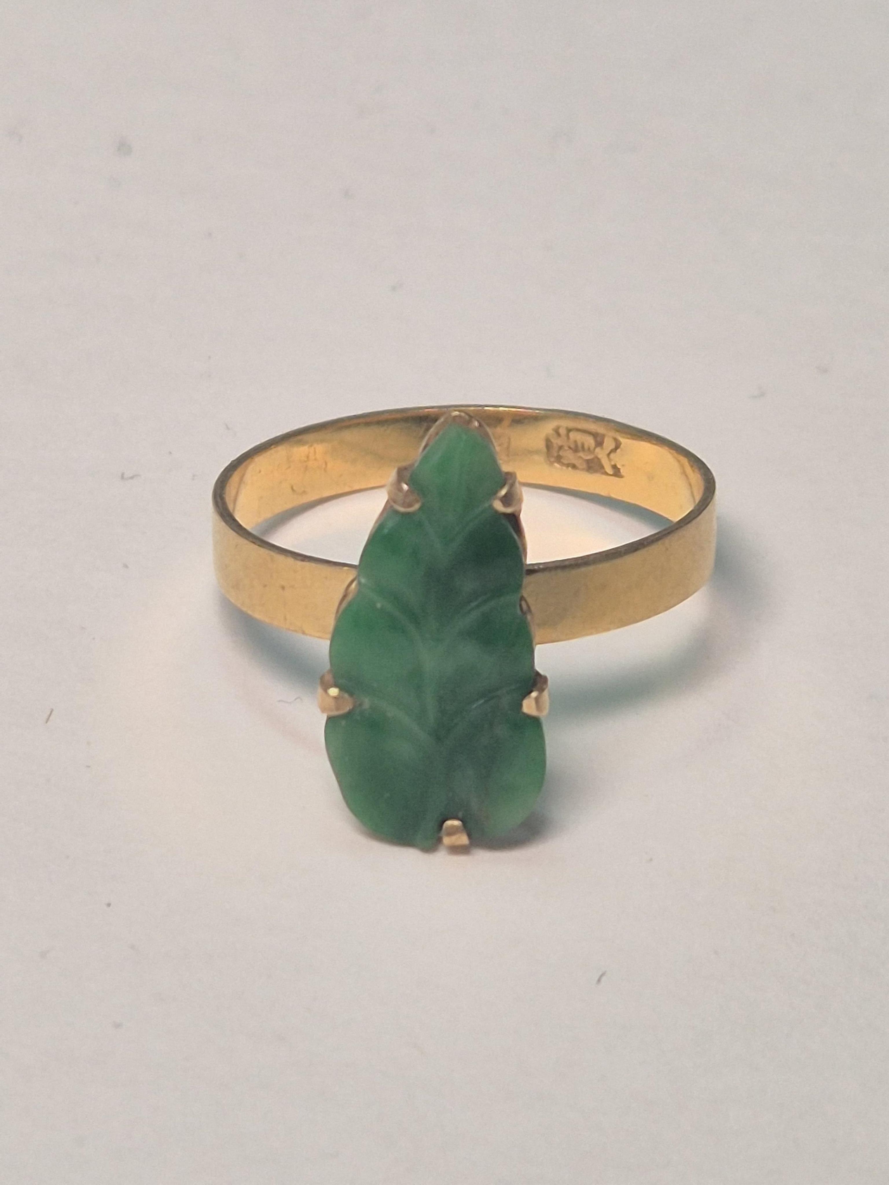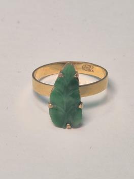 Lot 915 , A Chinese yellow metal and jadeite set ring, the stone carved as a leaf, size M, stamped P.M with Chinese character mark to shank interior.