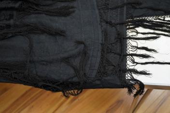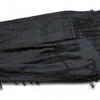 Lot 310 , A Edwardian black silk damask paisley patterned shawl. Possibly a mourning shawl.178cm x 156cm. Condition - one small hole, otherwise good.