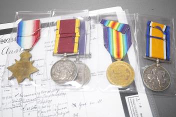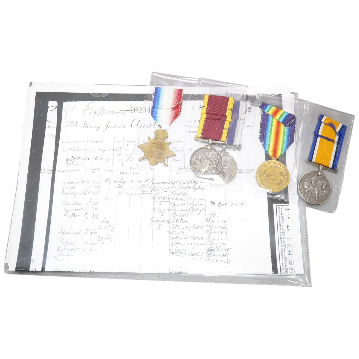 Lot 98 , A First World War medal group awarded to 202342 Henry James Austin, Y.S. R.N., comprising a First World War medal trio, a Naval Long Service and Good Conduct medal and a Victoria China 1900 medal, plus research from the