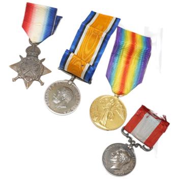 Lot 97 , A First World War medal group awarded to 234807 Thomas George Sharp(e), comprising a First World War trio and a George VI Rocket medal, together with research from the National Archives