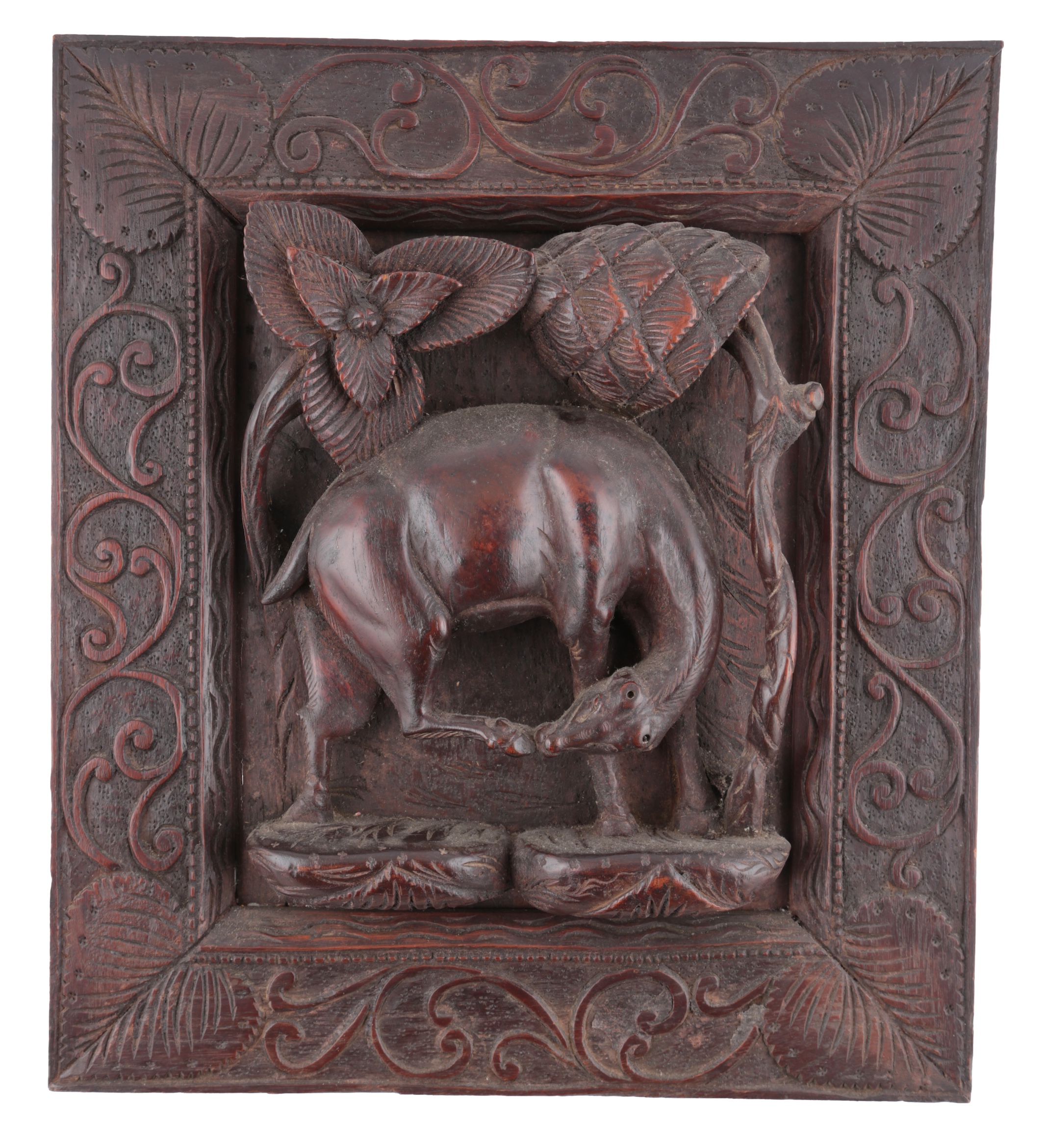 carved in high relief and openwork work with a stag (lacking horns) beneath branches, the border carved in relief with scrolls and leaf spandrels, 44.5cm x 39cm