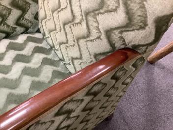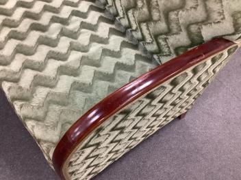 Arms of settee and one arm of an armchair with later mahogany stain, images 4 and 5; one settee arm with unsightly scrapes; upholstery fair to good; all gimp complete.