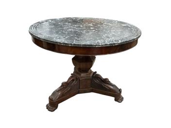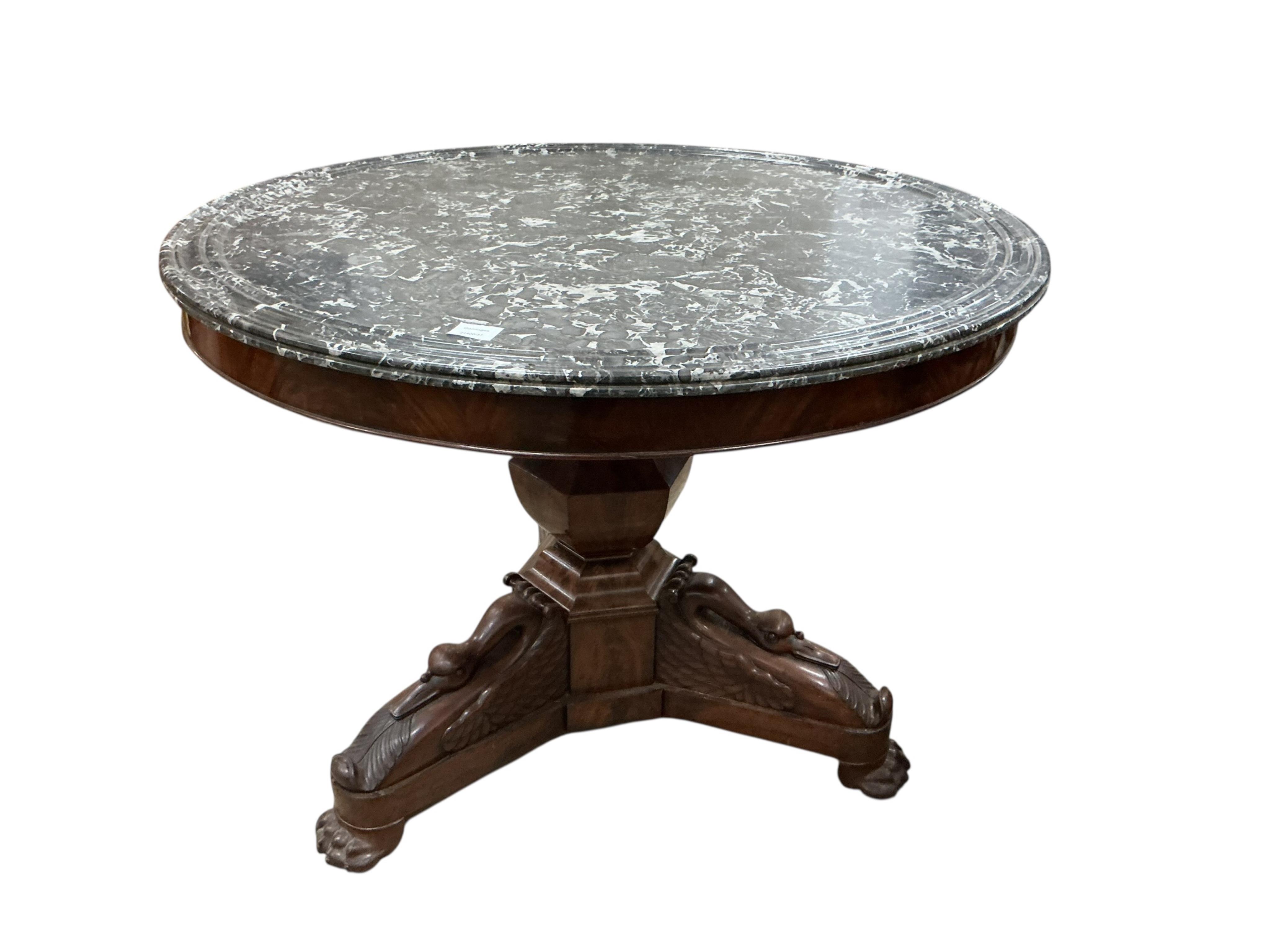 Lot 1036 , A French Empire circular mahogany marble top centre table, diameter 97cm, height 74cm