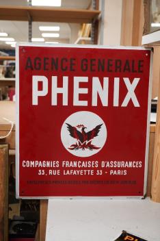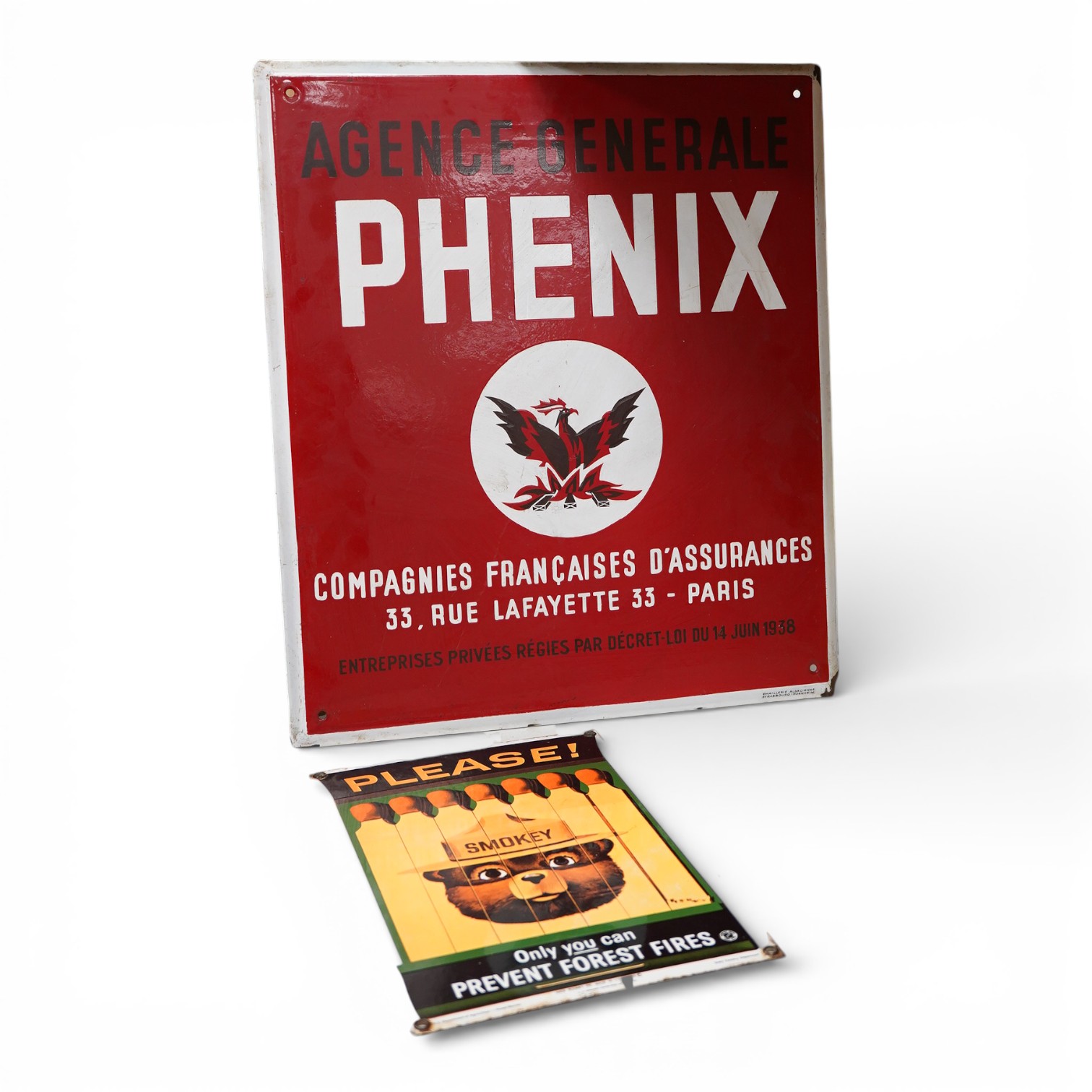 A French enamel sign, Phenix Agence Generale, 46x40cm, together with a reproduction enamel sign, Smokey Please, 1988 Copyright, (2)