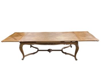 Lot 2099 , A French rectangular parquetry draw leaf dining table on acanthus carved cabriole legs, width 199cm, (320cm extended), depth 119cm, height 76cm