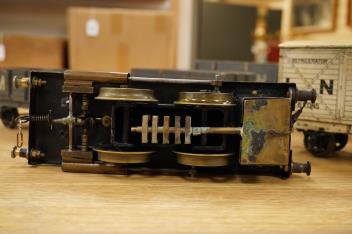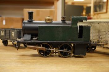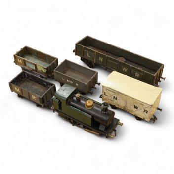 Lot 292 , A Gauge One live steam 0-4-0T locomotive in the style of a Bowman model locomotive, with spirit fired with two simple outside oscillating cylinders, together with five LNWR and Midland Railway freight wagons, including a