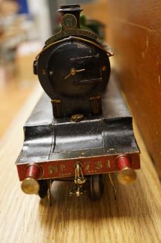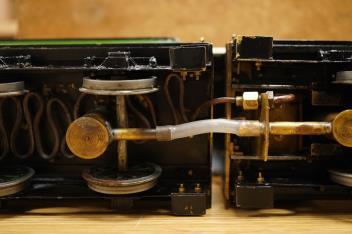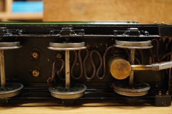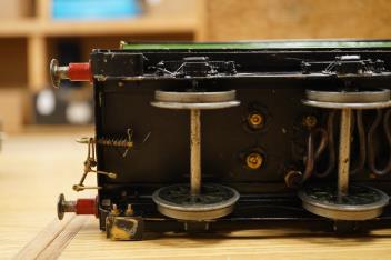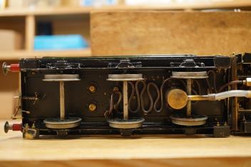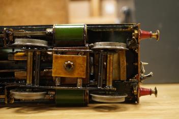 The model is a working four cylinder compound, with high pressure cylinders outside (11mm bore and 16mm stroke) and low pressure cylinders inside (13.5mm bore and 20mm stroke), but with inside slip eccentric valve gear and slide valves. The inside valve gear actuates the valves to the high pressure outside cylinders through rocker arms, as on the prototype, other details include sprung buffers and axle boxes, hand pump in the tender, etc., together with a plywood carrying case