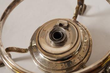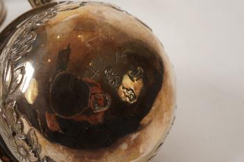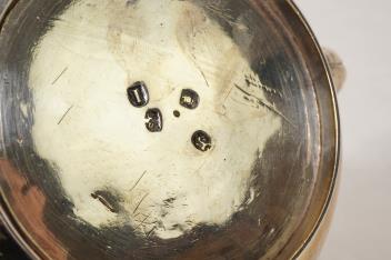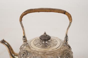 Several small nicks to the inner rim of the kettle cover. Hinge pin missing from cap on top of the burner. Rattan on handle later? Overall condition is otherwise good. Hallmarks clear.