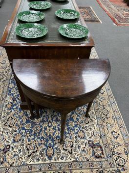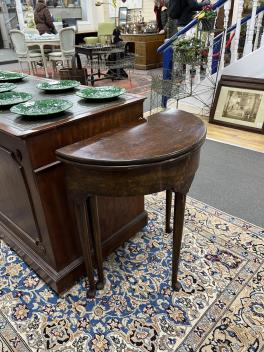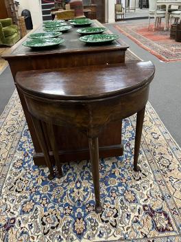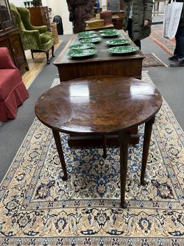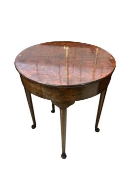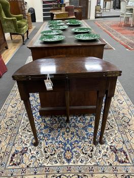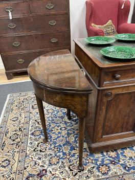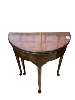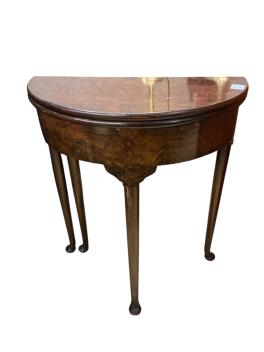 Lot 195 , A George II style burr walnut fold over demi lune tea table, width 61cm, depth 30cm, height 69cm