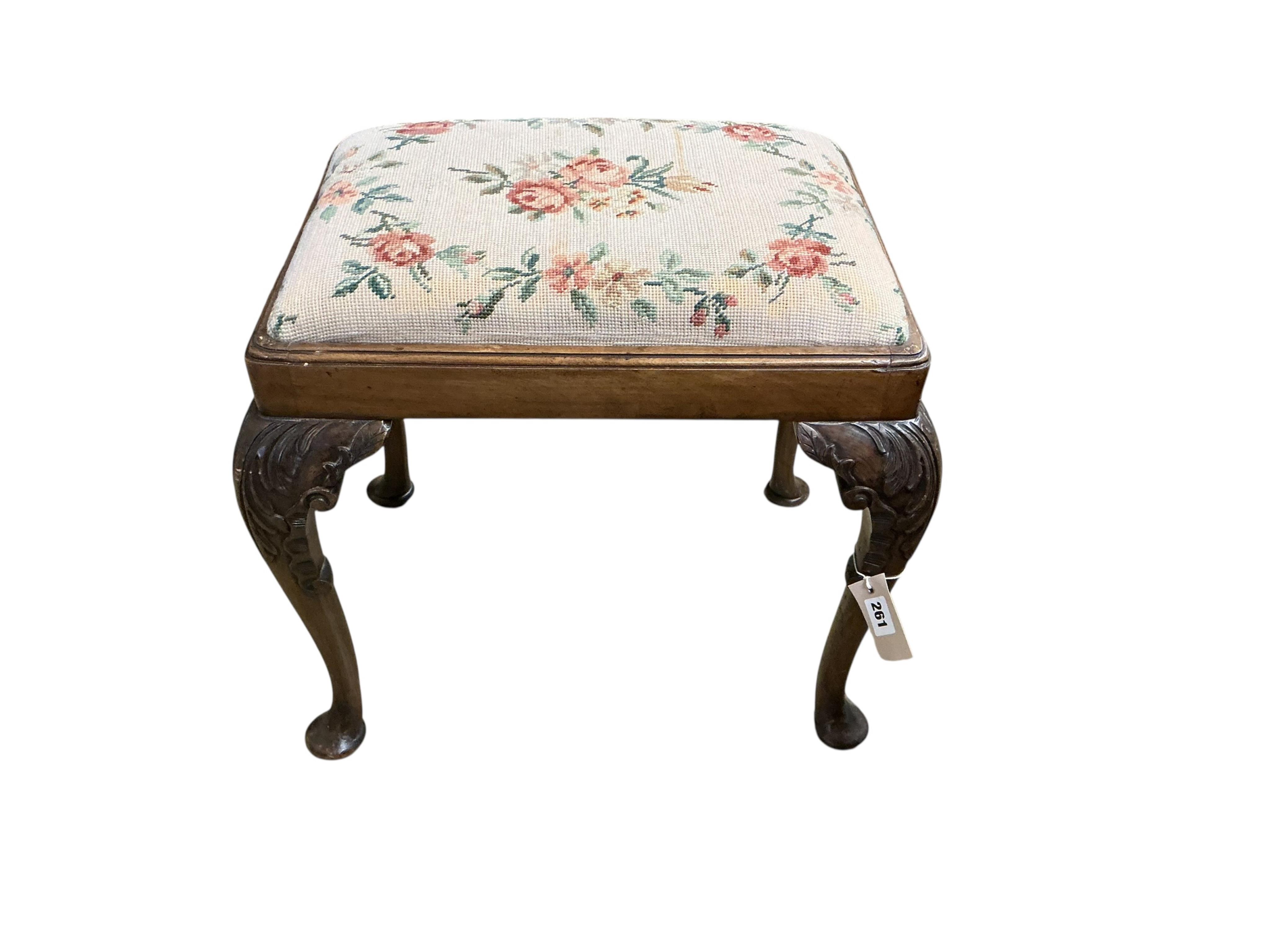 Lot 261 , A George II style carved walnut dressing stool, width 54cm, depth 40cm, height 48cm