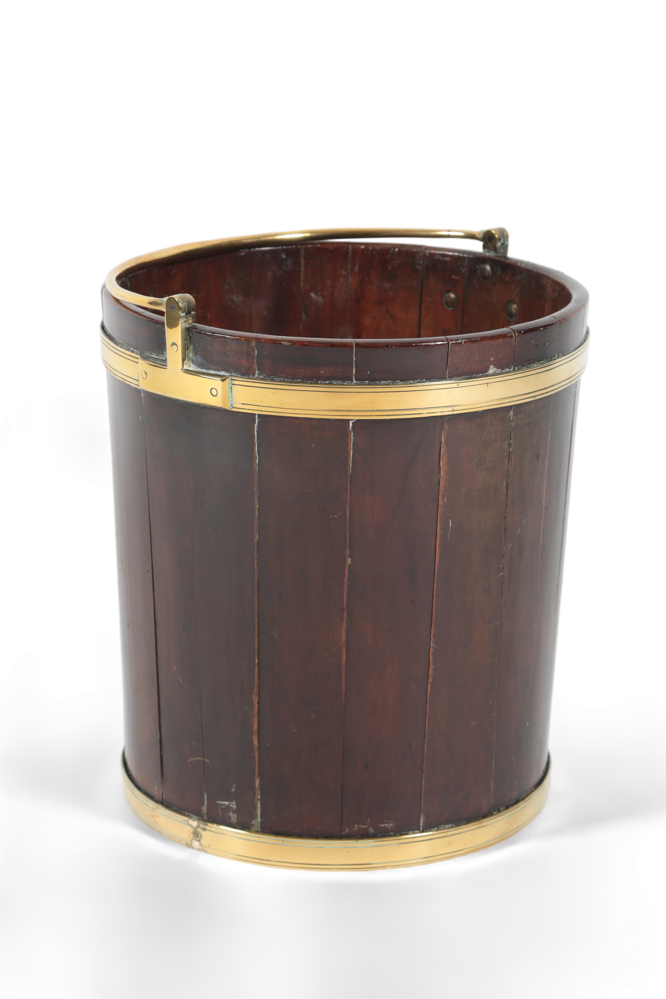 A George III brass bound staved mahogany peat bucket, with brass swing handle, 37cm diameter, 41cm high