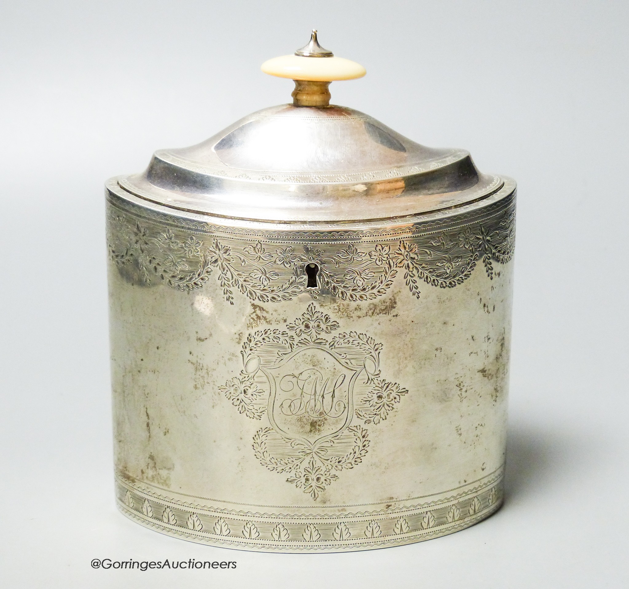 A George III engraved oval tea caddy, with ivory knop, no key, Henry Nutting, London, 1796, length 13.4cm, gross weight 12.5oz.