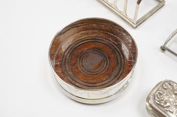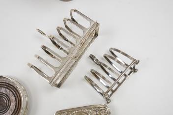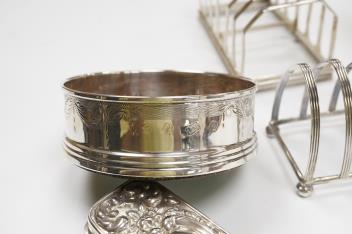 A George III engraved silver helmet shaped cream jug, Henry Chawner, London 1788(repair), height 15.3cm, together with two George V silver toast racks, a silver mounted glass toilet jar and a modern silver mounted bottle coaster.