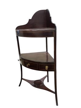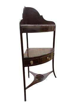 Lot 1075 , A George III inlaid mahogany bow fronted corner washstand, width 56cm, depth 37cm, height 103cm