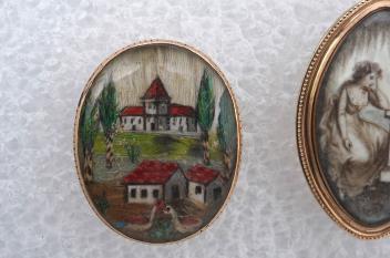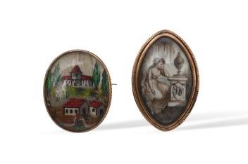 A George III ivory mourning brooch, circa 1786, and a feather work brooch, 19th century, comprising: a brooch of navette-shaped outline, set with an ivory miniature depicting a woman by a grave, initialled RW, mounted in gold, the reverse inscribed 'Rod'k Wilson Obt 22 Sept 1786 Aet 45 6M, & 11 Days', length 3.6cm; an an oval brooch, the glazed centre containing a townscape constructed from feathers, mounted in gold, length 2.9cm CITES Submission reference Y3HD35NF