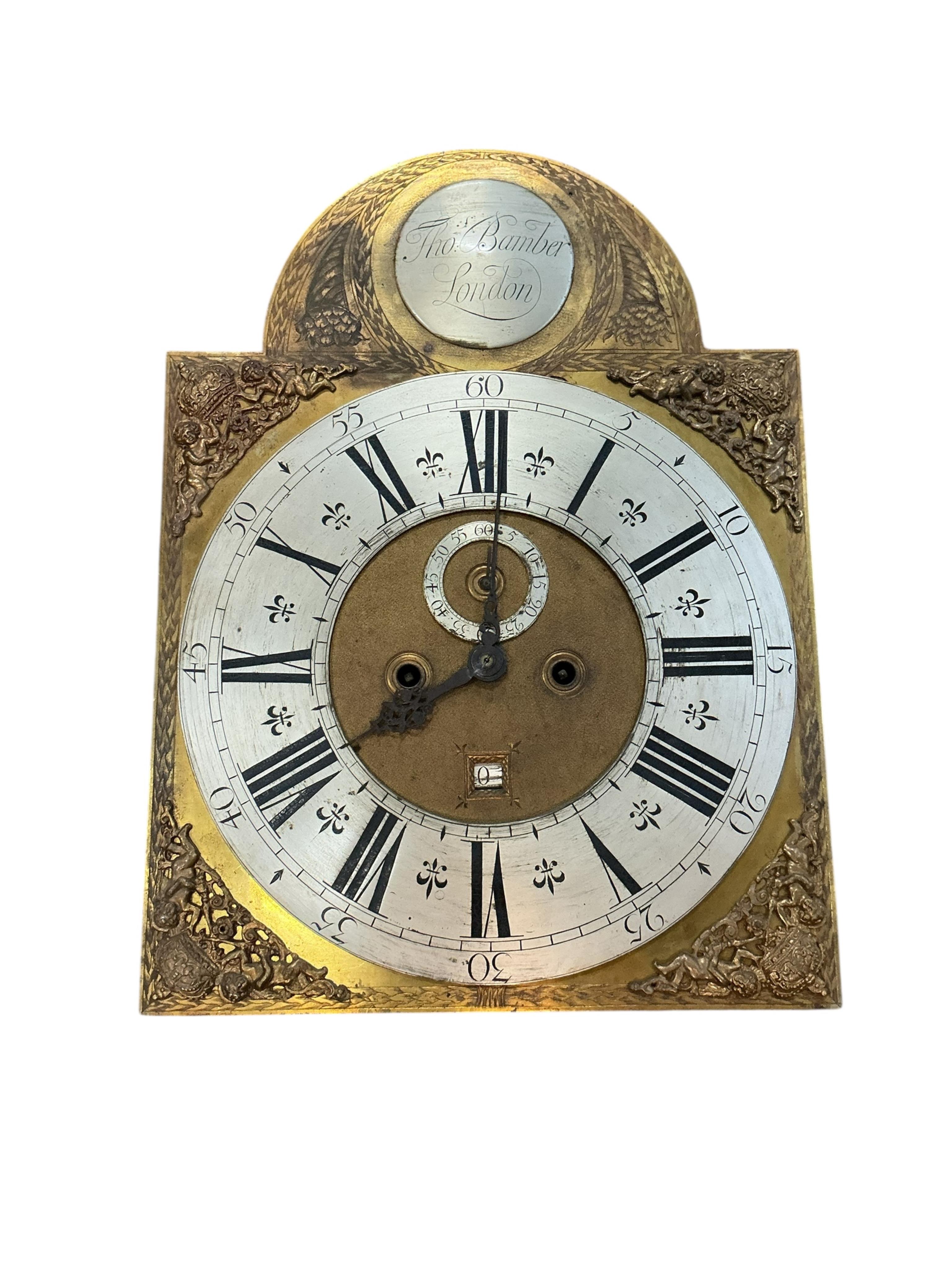 A George III mahogany eight day longcase clock movement by Thomas Bamber, London, dial width 36cm, height 48cm