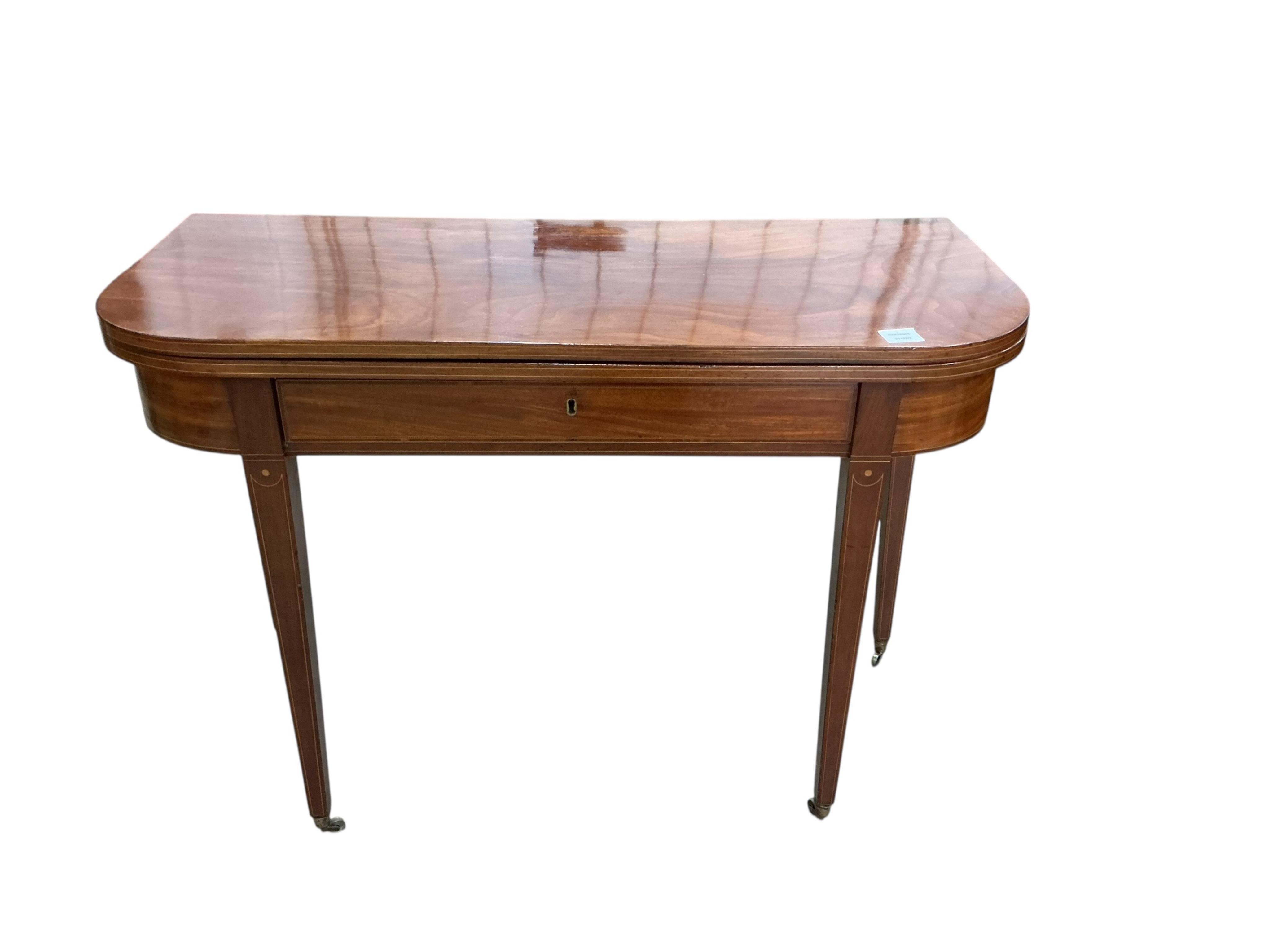 A George III mahogany folding tea table, width 108cm, depth 48cm, height 75cm