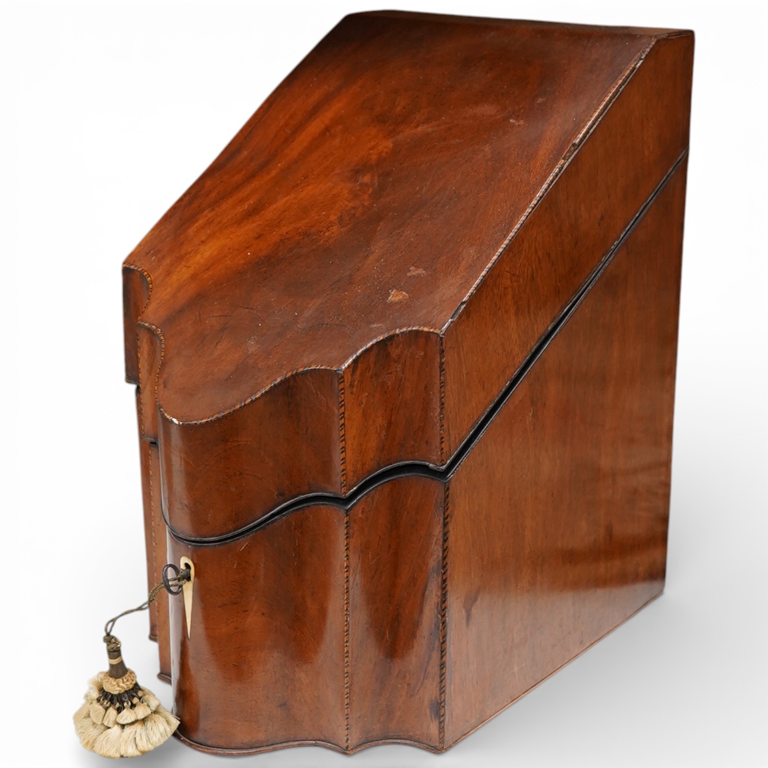 A George III mahogany serpentine fronted knife box, with bone escutcheon and key, 36cm high
