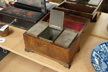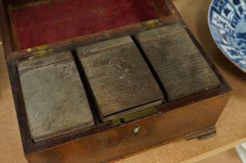 A George III mahogany tea caddy, containing tinned metal canisters, 25cm wide