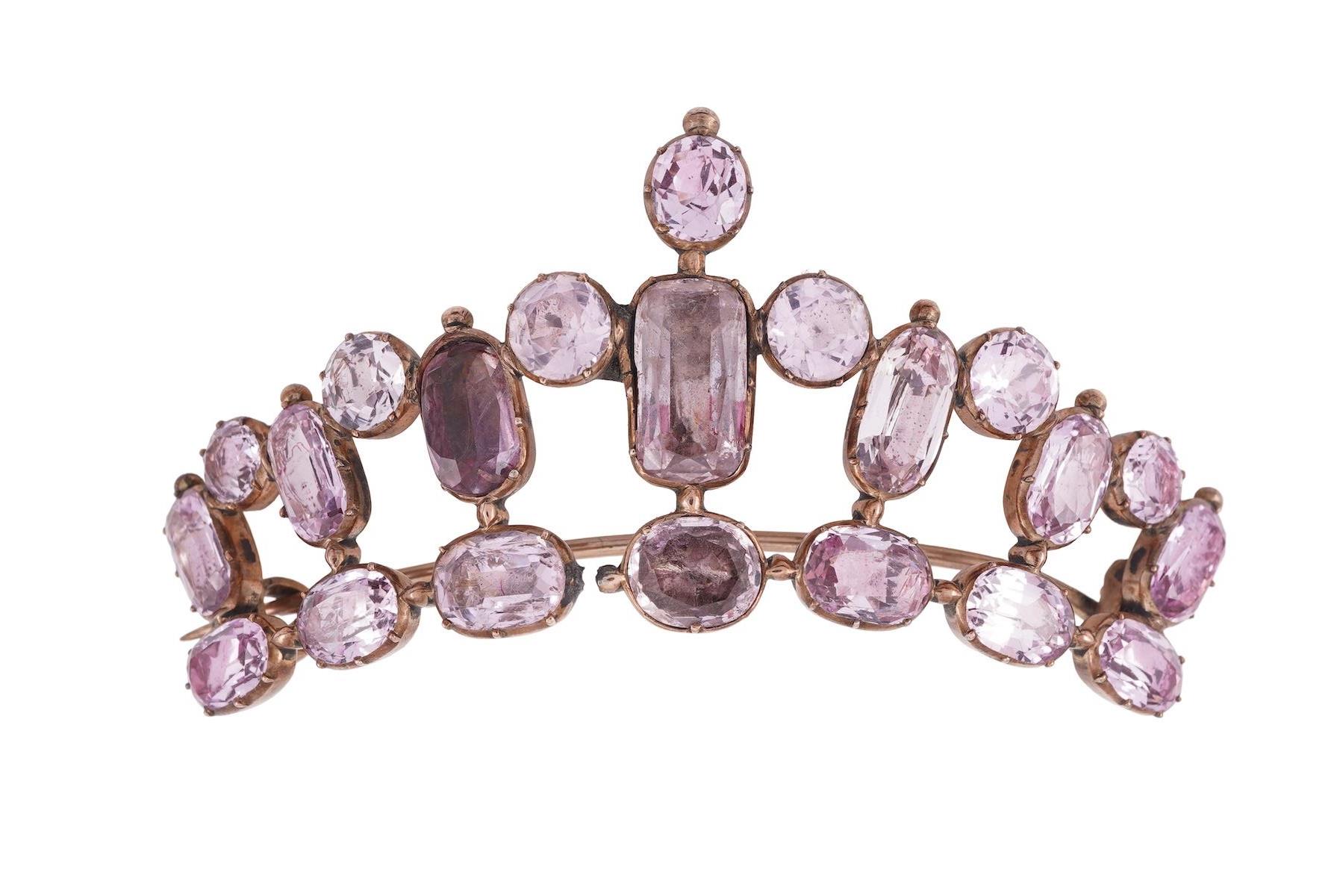 A George III pink topaz brooch/hair ornament, early 19th century, of diadem design, composed of cushion-shaped and circular-cut pink topazes in closed settings, mounted in gold, length 7.8cm, one stone replaced with rock crystal