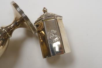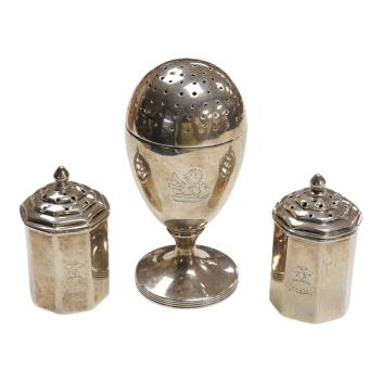 Lot 2839 , A George III provincial silver egg shaped pedestal pepperette, by Christian Ker Reid, Newcastle, circa, 1810, height 89mm, together with a pair of late Victorian octagonal pepperettes.