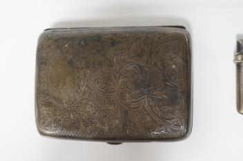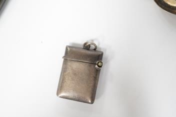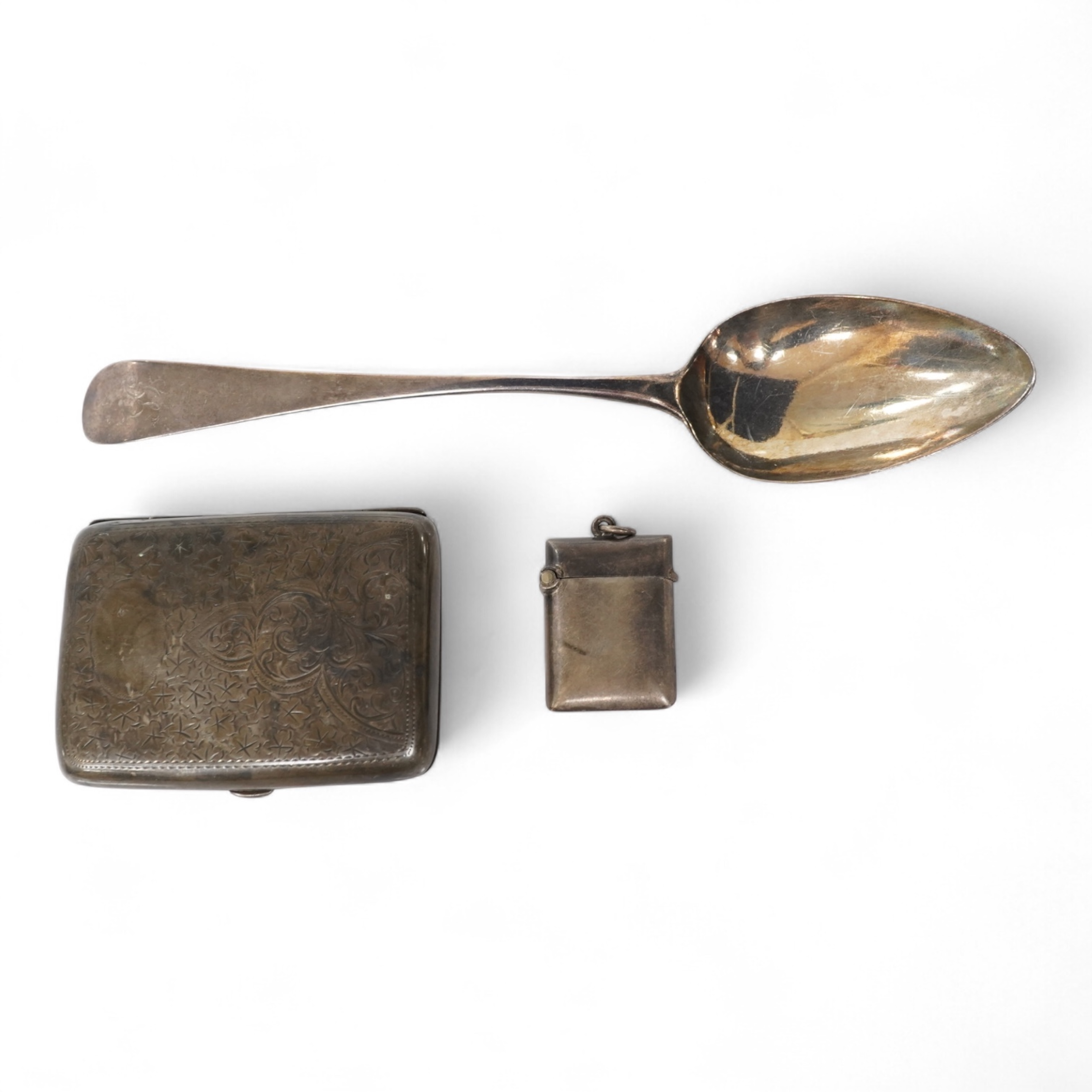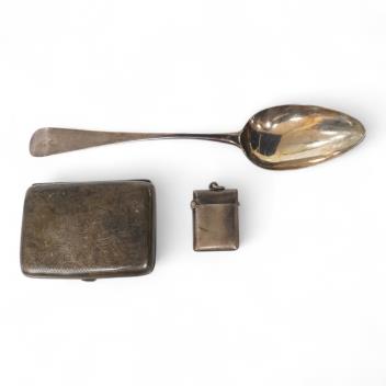 A George III silver Old English pattern tablespoon, by Peter, Ann & William Bateman, London, 1801, 21.7cm, together with a silver vesta case and cigarette case.
