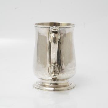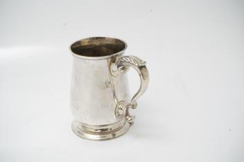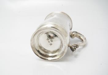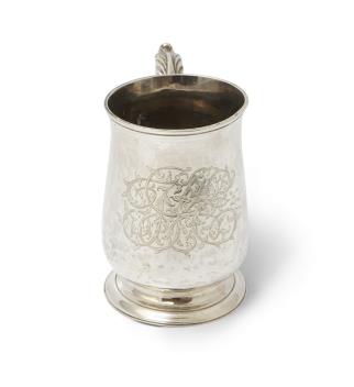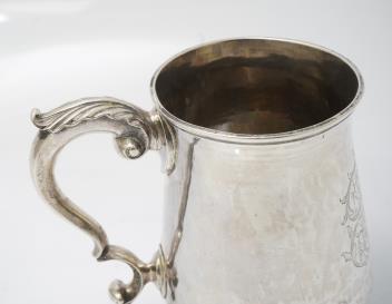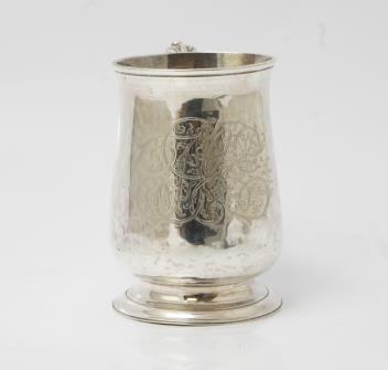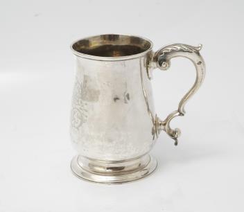 A George III silver baluster mug, by John King, with acanthus leaf capped scroll handle and large ornate engraved monogram, London 1774, height 12.5cm, 13oz.